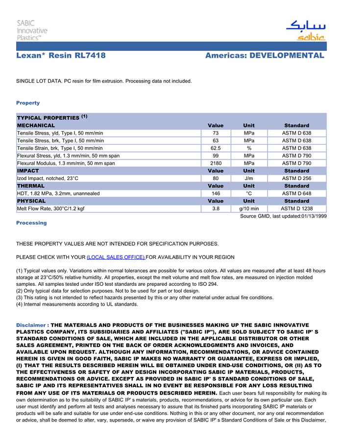 应用范围:产品描述LEXAN PC RL7418物性表SINGLE LOT DATA. PC resin for film extrusion. Processing data not included.