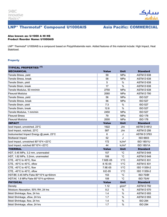 LNP* Thermotuf* U1000AIS is a compound based on Polyphthalamide resin. Added features of this material include: High Impact, Heat Stabilized.