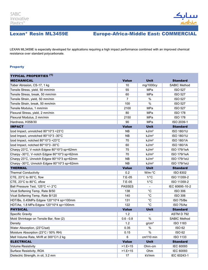 LEXAN ML3459E is especially developed for applications requiring a high IMPACT performance combined with an improved chemical resistance over standard polycarbonate.
