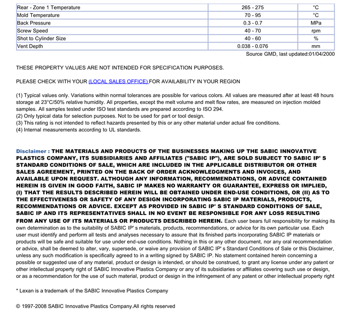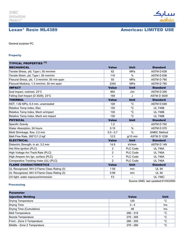 应用范围:产品描述LEXAN PC ML4389物性表General purpose PC.