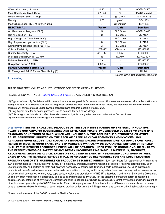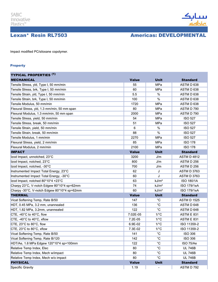 应用范围:产品描述LEXAN PC RL7503物性表IMPACT modified PC/siloxane copolymer.