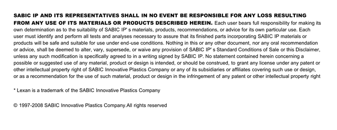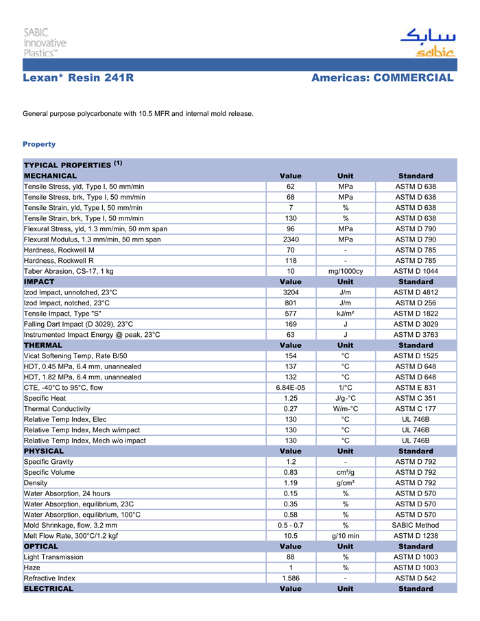 应用范围:产品描述Lexan PC 241R物性表熔体流动速率MFR:10.5。改良的阻燃性能。内含脱模剂。相关颜色色号:241R-111BZDD、241R-111、241R-WH7E206X、241R-GY3D066T、241R-1T8D001T、241R-701、241R-OR8B007、241R-YW8C033、241R-GY8A480T、241R-GN8B014T、241R-GY3395、241R-