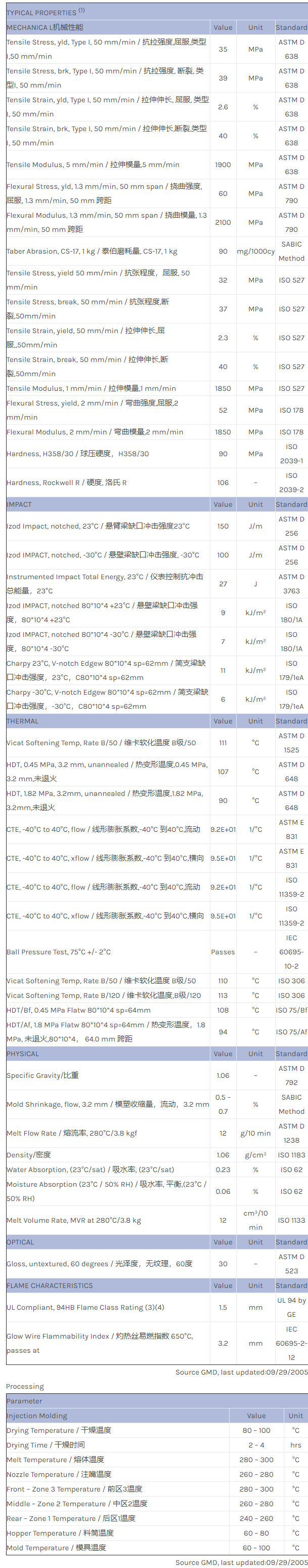 应用范围:产品描述NORYL PPO EXNL0099物性表Noryl* EXNL0099 is an unfilled, modified polyphenylene ether resin designed for injection molding. This resin combines many of the inherent properties of Noryl resins with a u