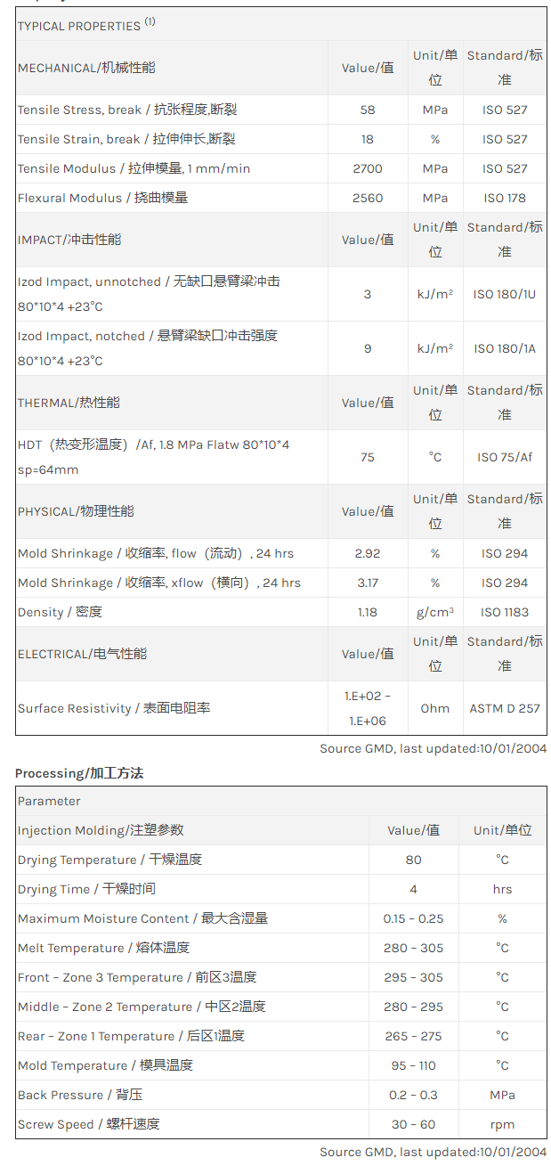 应用范围: 产品描述 LNP Statkon RD000IXP物性表 “LNP STAT-KON RD000IXP是一种聚酰胺66(尼龙66)产品,含有的填充物为炭粉,可以通过注射成型进行加工。 特性包括: 传导性 耐冲击” LNP STAT-KON* RD000IXP is a compound based on Nylon 66 resin containing Carbon Powder
