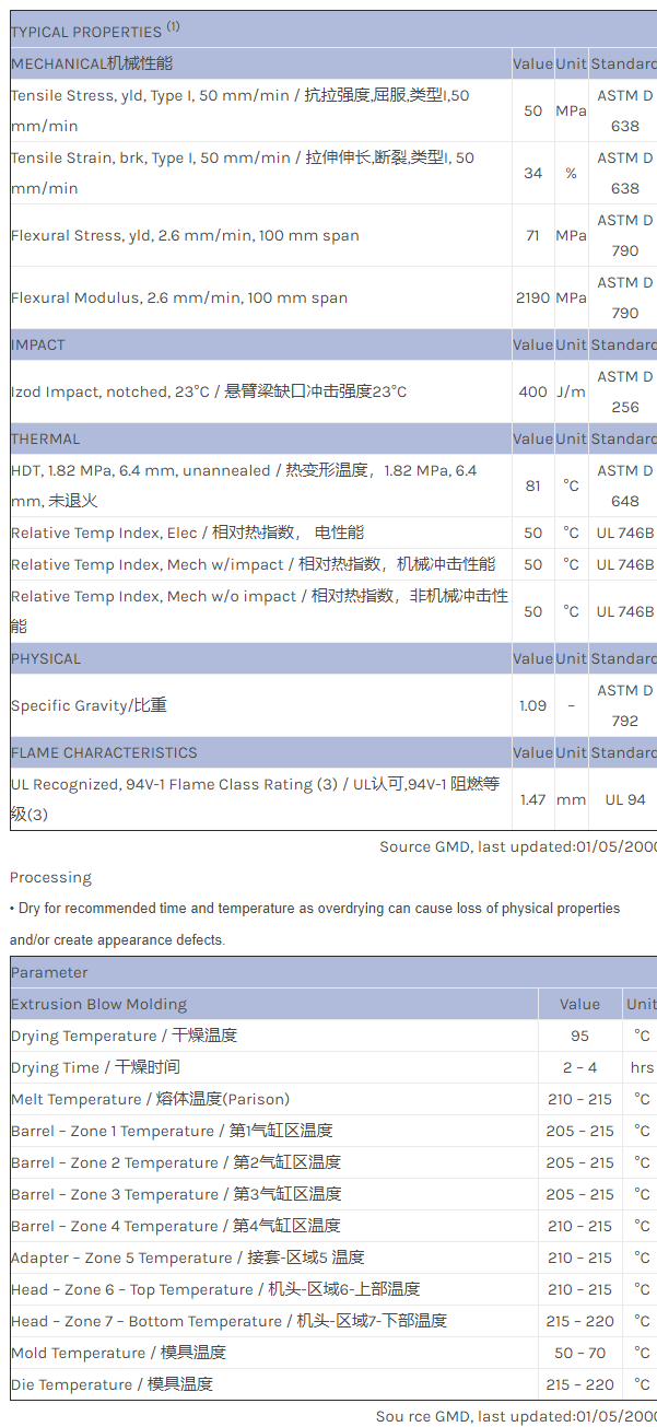 应用范围:产品描述NORYL PPO BN5308物性表吹塑级。HDT(热畸变温度):179F (82C)。 V-1性能。高熔体强度。